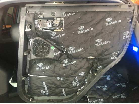 拆開門板后發(fā)現(xiàn),原車并沒有進(jìn)行有效的隔音。施工的師傅先給門板貼上一層美特靜的止震板,在增加門板金厚度的同時,噪音也基本會被阻隔在門外。