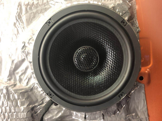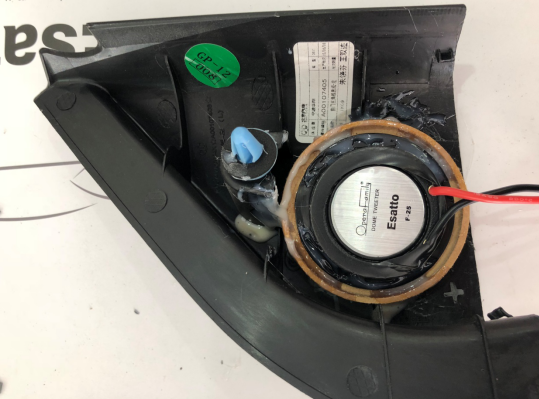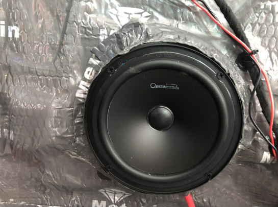 門板隔音完成后,開始進(jìn)行前聲場喇叭的安裝,這一套歌劇世家F-25兩分頻套裝喇叭,是車主在試音間試聽了2個多小時之后選定的產(chǎn)品。它的特性是高音透亮,中音沉穩(wěn),而在低音方面,也不乏下潛的震感。下圖為中低音喇叭原位安裝在們板上。