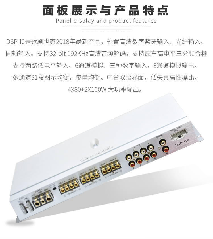 采用4組高電平喇叭線輸入,4組低電平RCA輸入和同軸數(shù)字音頻信號輸入,4X60W功率輸出,48位雙核CPU處理器。