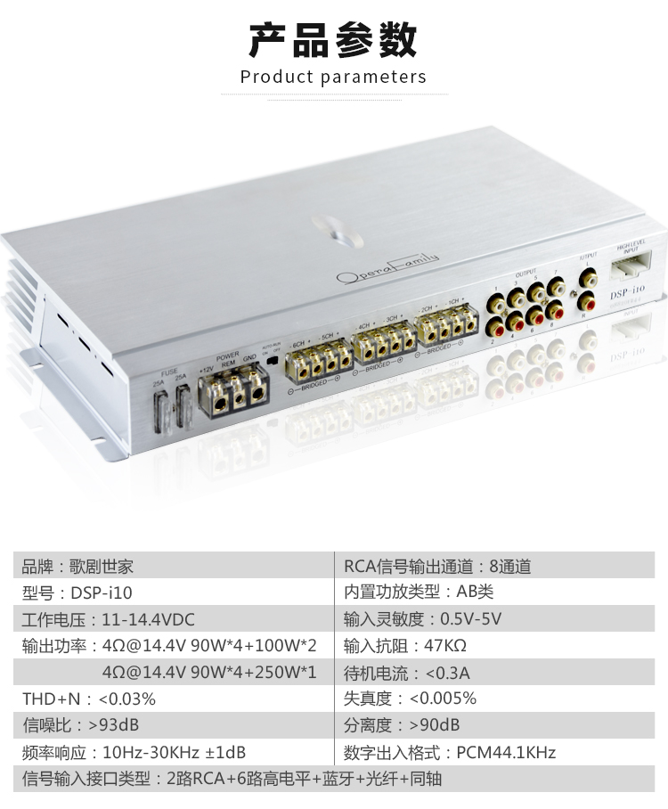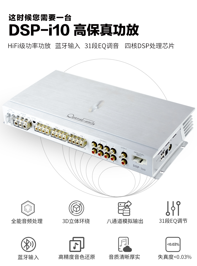 專車專用汽車音響功放DSP-i10采用專車專用線材,實(shí)現(xiàn)三百多種車型與原車對接而不破壞原車的線路,實(shí)現(xiàn)無損升級音響系統(tǒng)。擴(kuò)張用的8路RCA輸出,滿足音響愛好者大的可玩空間。