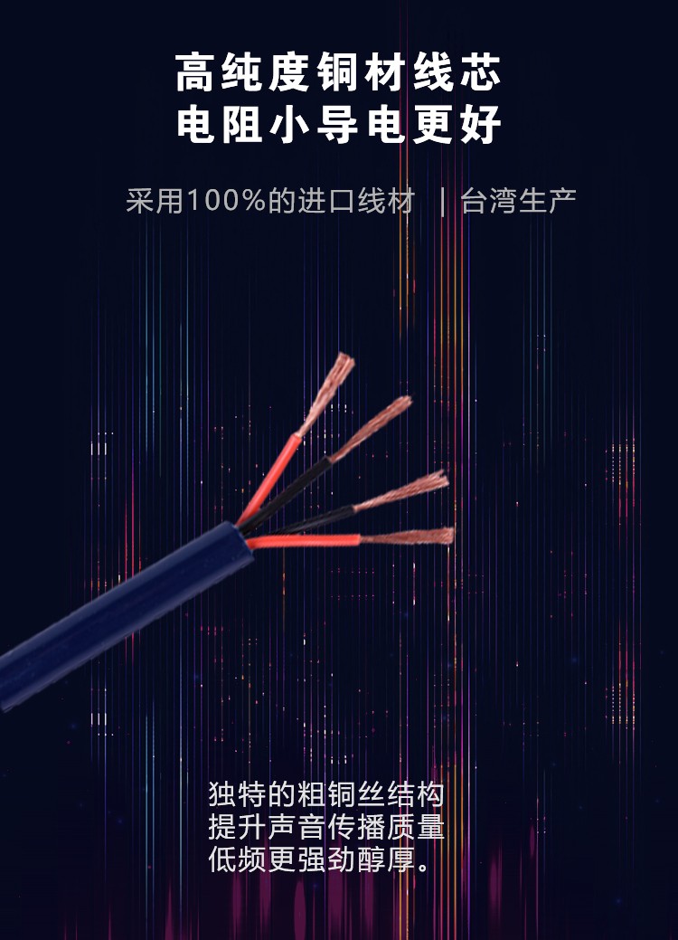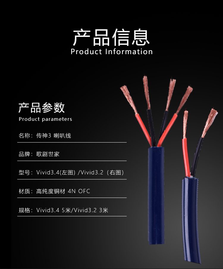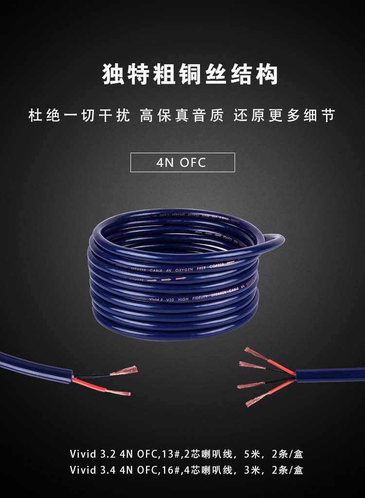 vivid 3.2 4N OFC,13#,2芯喇叭線,5米,2條/盒 vivid3.4 4N OFC,13#,4芯喇叭線,3米,2米/盒 歌劇世家vivid3喇叭線,是100%的線材,4N OFC純銅多股緊密對焦傳輸,保證聲音穩(wěn)定真實(shí)的傳輸還原性。高純度銅材線芯,電阻小導(dǎo)電性更好。 獨(dú)特粗銅絲結(jié)構(gòu),提升聲音傳播質(zhì)量,低頻更強(qiáng)勁醇厚。 全頻平衡度好,聲音密度質(zhì)感好,還原音樂每個(gè)細(xì)節(jié)。