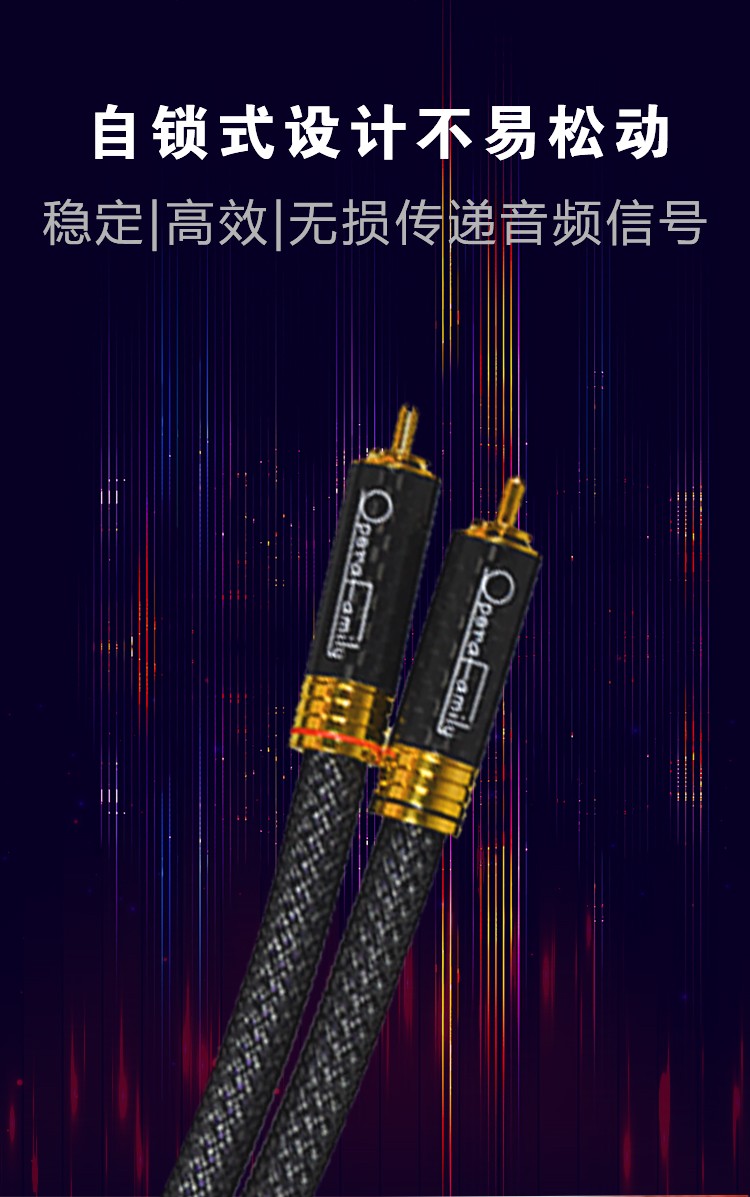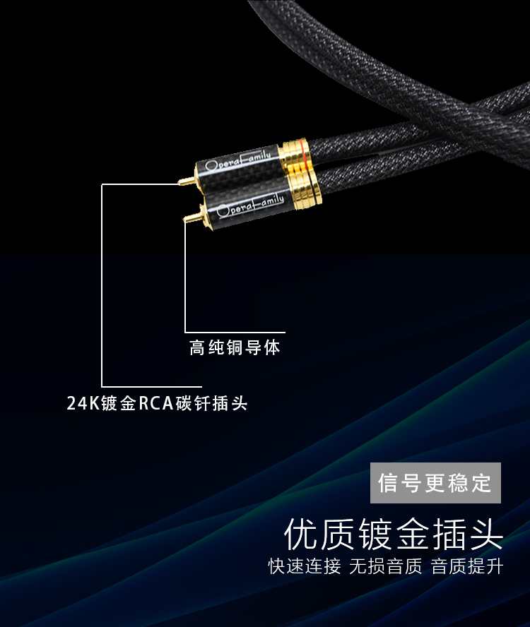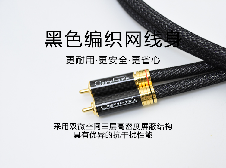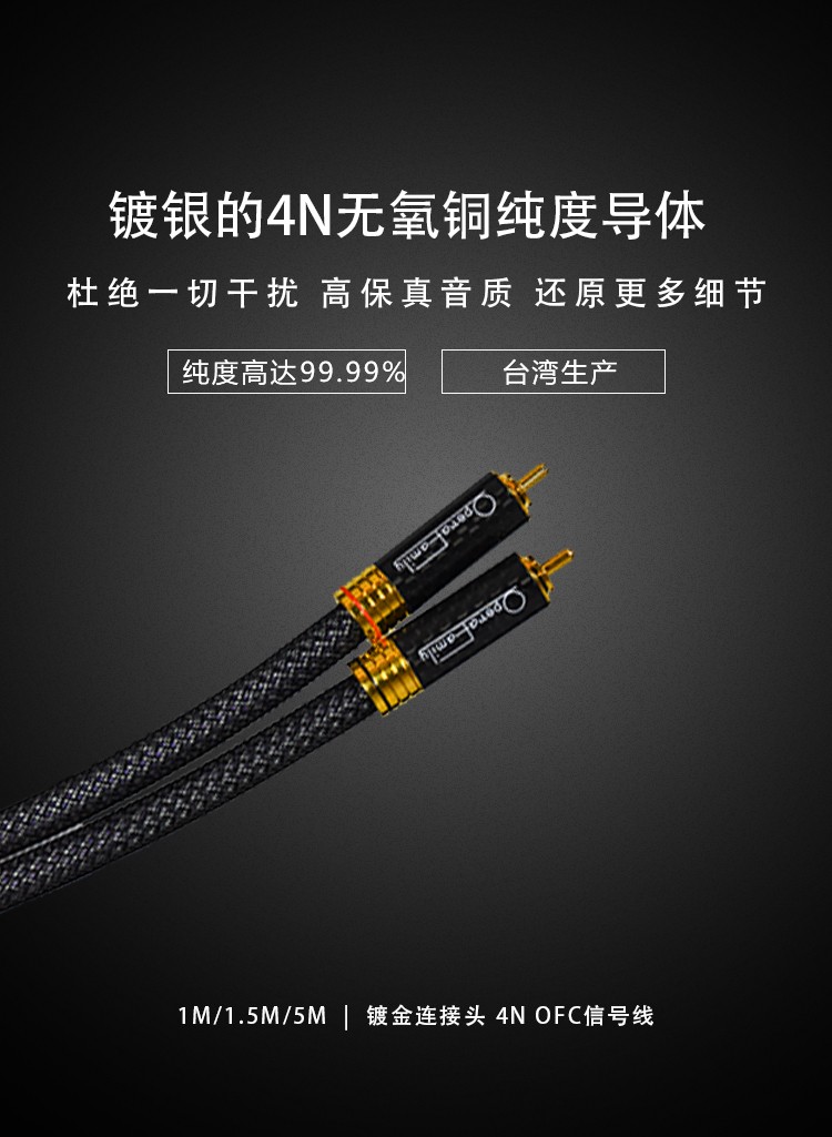規(guī)格:1m、1.5m、5m 鍍金連接頭 4N OFC信號線 歌劇世家極致3信號線導體采用鍍銀的4N無氧銅純度導體,純度高達99.9%,24k鍍金的RCA碳纖插頭,自鎖式設計不易松動,能夠穩(wěn)定、高效、無損的傳遞音頻信號。 5米那條信號線 則采用雙微空間三層高密度屏蔽結構,具有優(yōu)異的抗干擾性能。高頻具有更好的延伸,中頻密度感好,低頻快速有力。