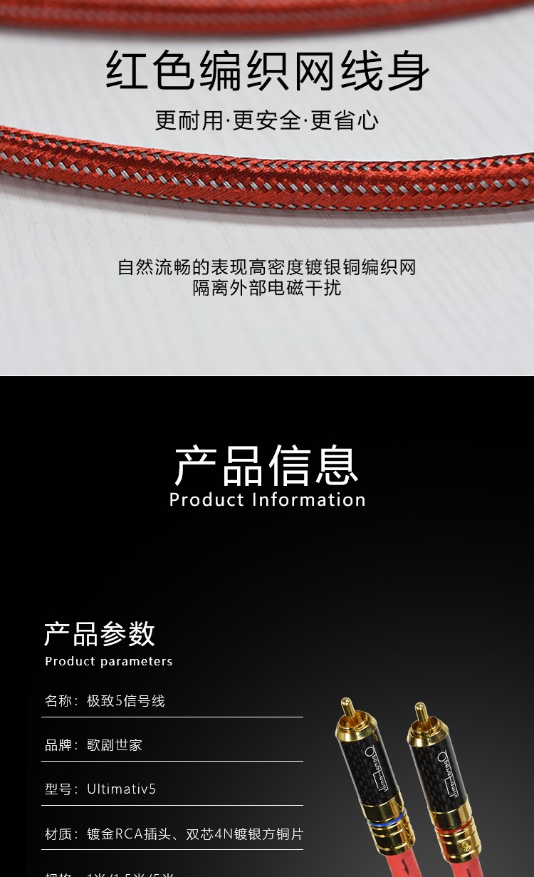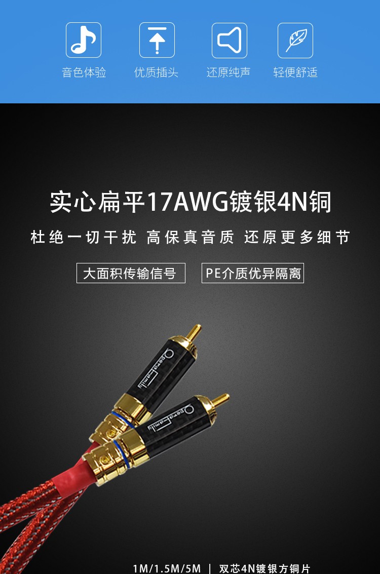 1米:雙芯4N鍍純銀方銅片,鍍純金純紫銅RCA插頭,信號線1對/盒 1.5米:雙芯4N鍍純銀方銅片,鍍純金純紫銅RCA插頭,信號線1對/盒 5米:雙芯4N鍍純銀方銅片,鍍純金純紫銅RCA插頭,信號線1對/盒