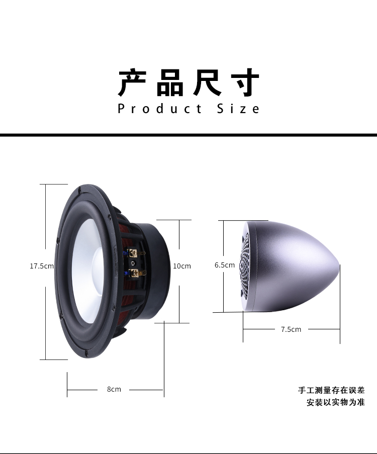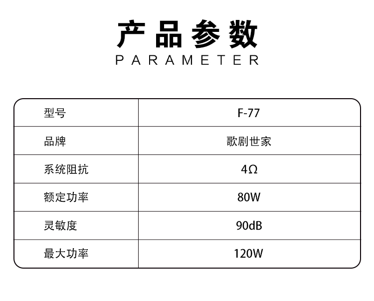 歌劇世家F-77全頻兩分頻喇叭:產品由2寸全頻喇叭和7寸低音單元組成。2寸全頻喇叭單元的單點聲源,很好地解決了高音和中音喇叭的分頻點、相位和延時等問題。全頻喇叭單元則采用了子彈頭設計的鋁合金箱體,整體剛性強且外觀科技感強。7寸低音單元擁有更大的振膜面積,低頻響應更寬。兩款單元都采用了歌劇世家獨家的鋁鎂合金振膜和合金鑄鋁盆架。 產品參數(shù):額定功率:80W / 最大功率:120W / 靈敏度:90dB / 系統(tǒng)阻抗:4Ω