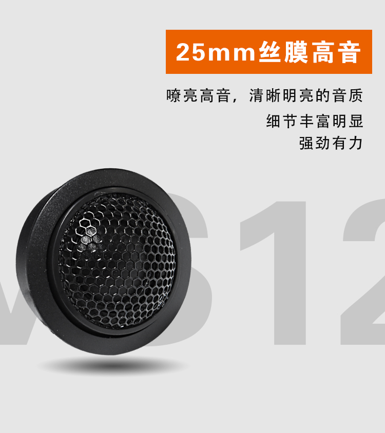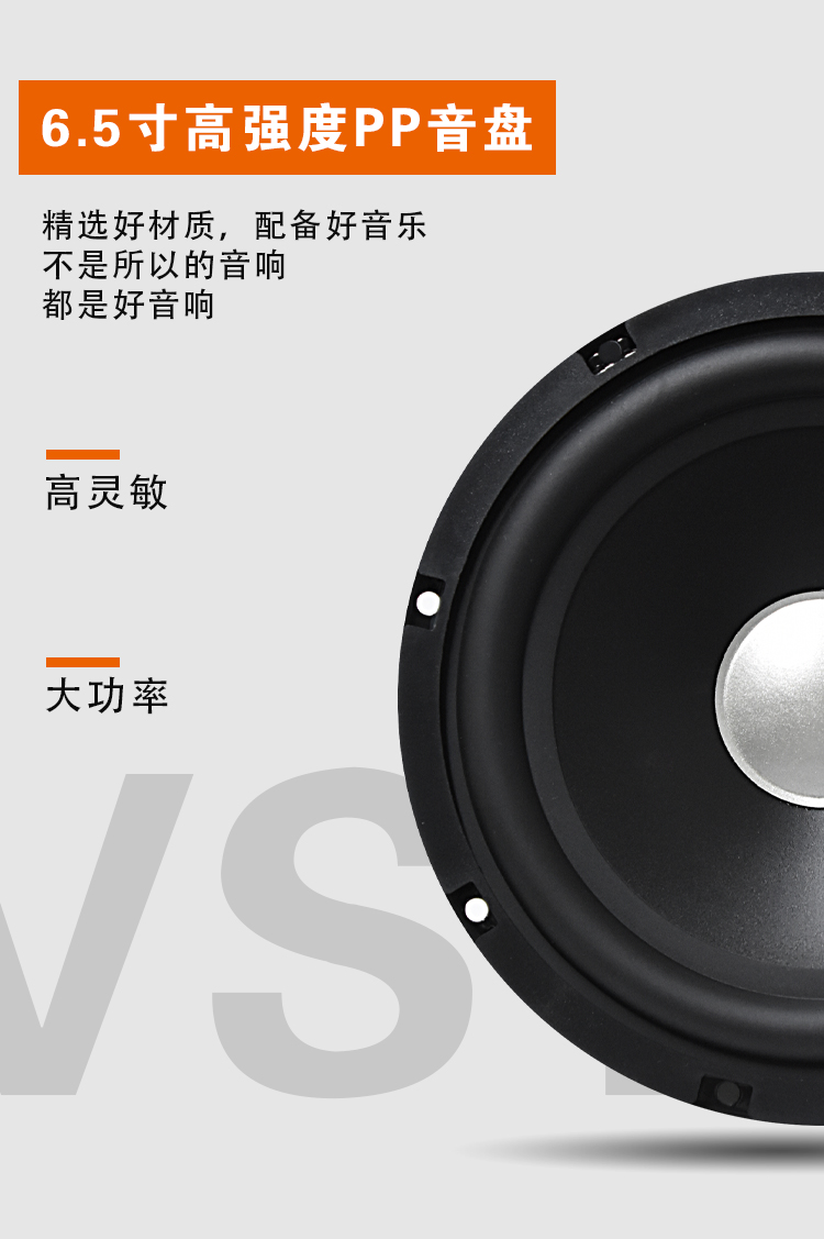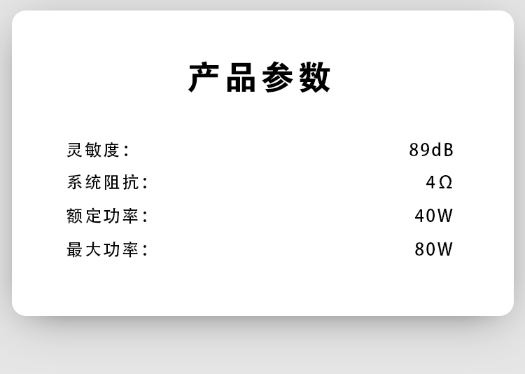 25mm絲膜高音,6.5寸高強(qiáng)度PP音盆,高靈敏度大功率。 額定功率:40W 最大功率:80W 系統(tǒng)阻抗:4Ω 靈敏度:89dB