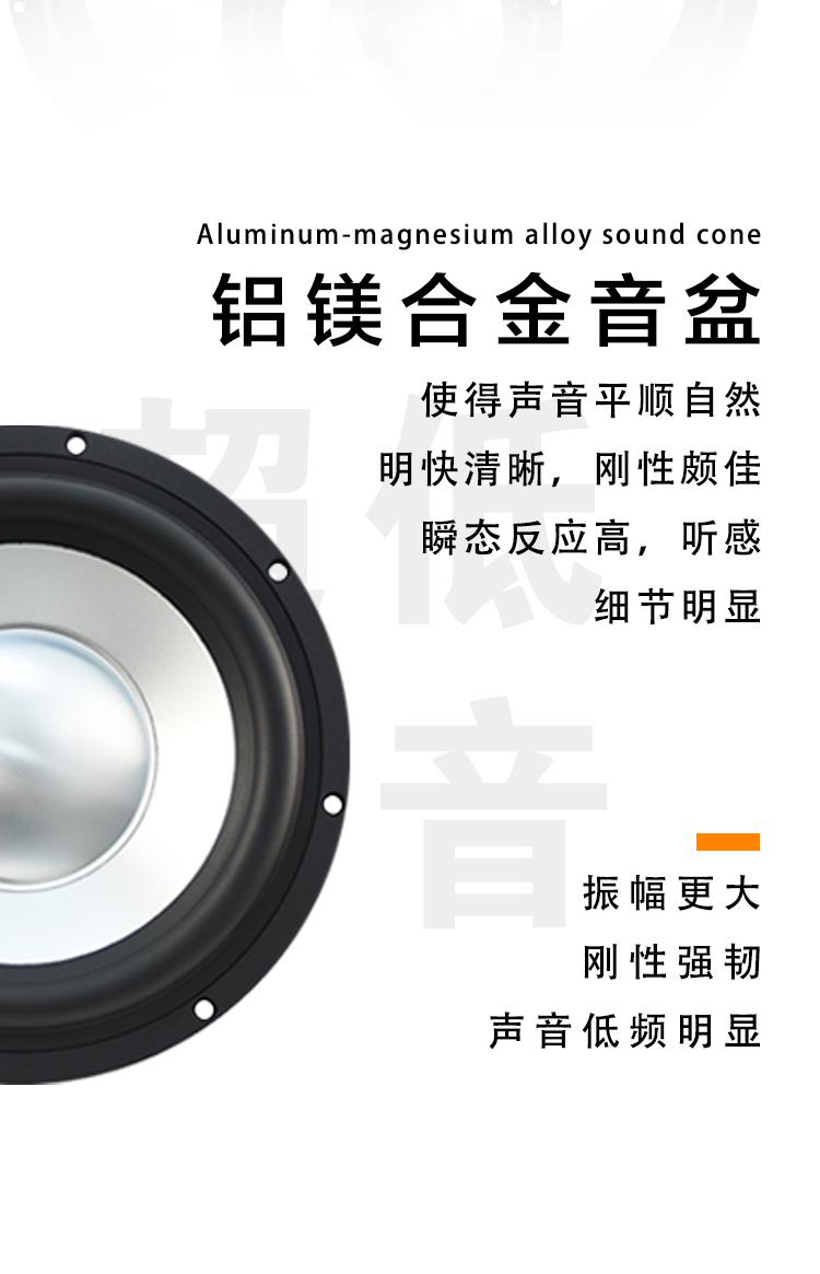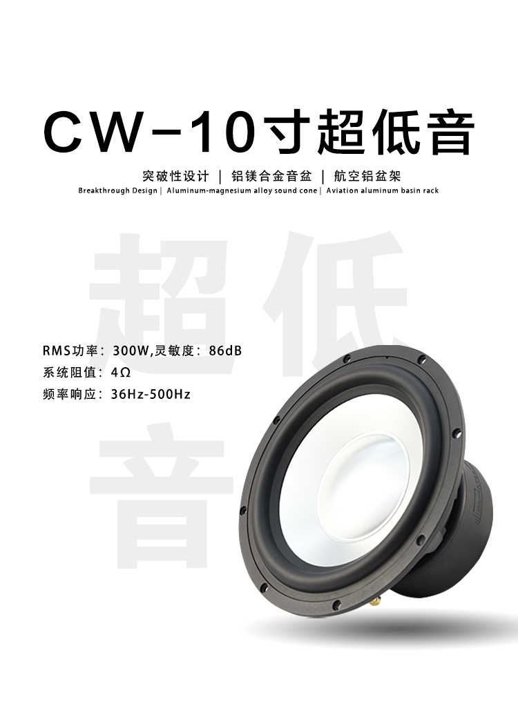 CW-8:Fo(Hz):48 / RMS功率:300W / 靈敏度:86dB / 系統(tǒng)阻抗:4Ω / 頻率響應(yīng):40Hz-500Hz CW-10:Fo(Hz):36 / RMS功率:300W / 靈敏度:86dB / 系統(tǒng)阻抗:4Ω / 頻率響應(yīng):36Hz-500Hz CW-12:Fo(Hz):25/ RMS功率:300W / 靈敏度:88.6dB / 系統(tǒng)阻抗:4Ω / 頻率響應(yīng):25Hz-500Hz 歌劇世家八寸、十寸、十二寸雙磁超低音,鋁鎂合金音盆,航空鋁盤架。