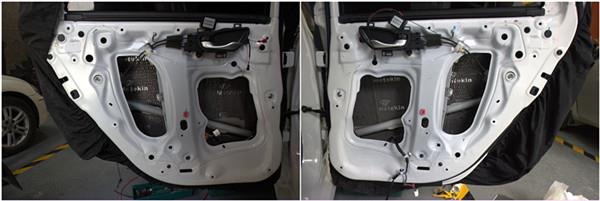 前門板進(jìn)行第一層隔音處理,加固車門鈑金,減少車門共振噪音。