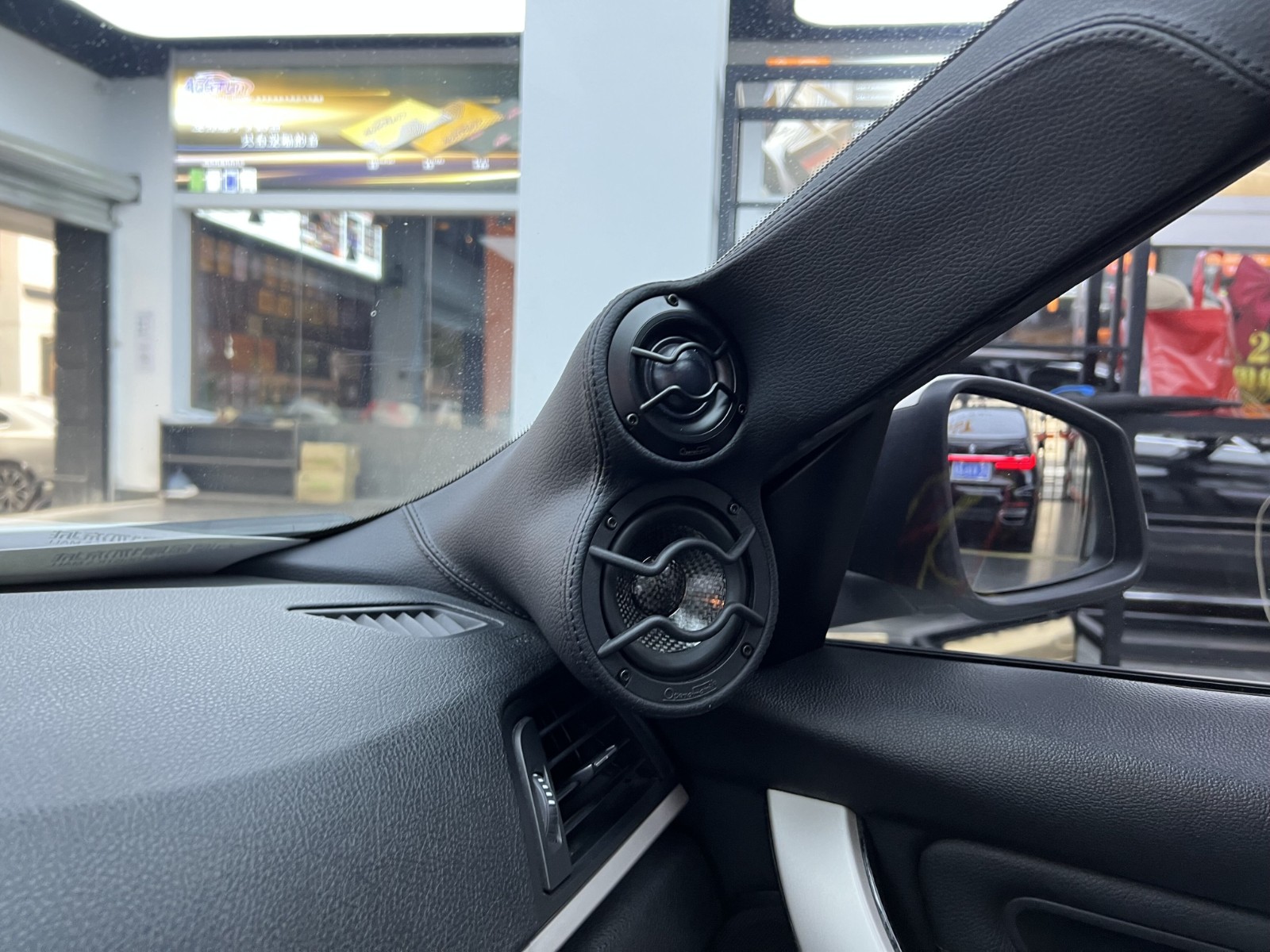 前聲場(chǎng)歌劇世家BS 83三分頻喇叭A柱、車門倒模安裝,六只喇叭的黑色金屬框架與原車內(nèi)飾很好的融為一體,毫無(wú)突兀感。