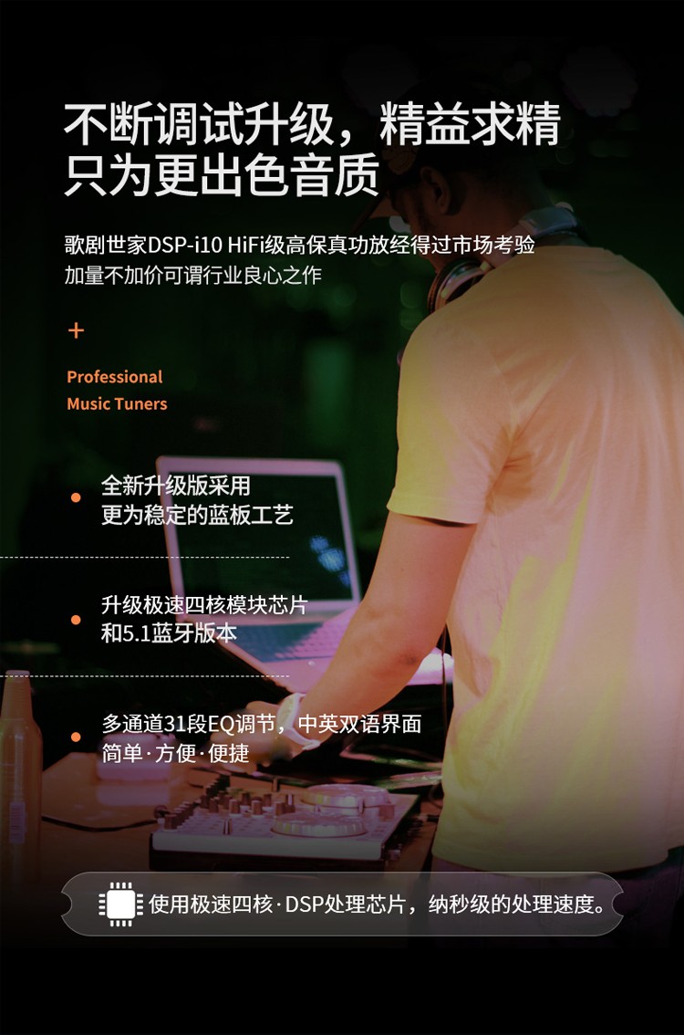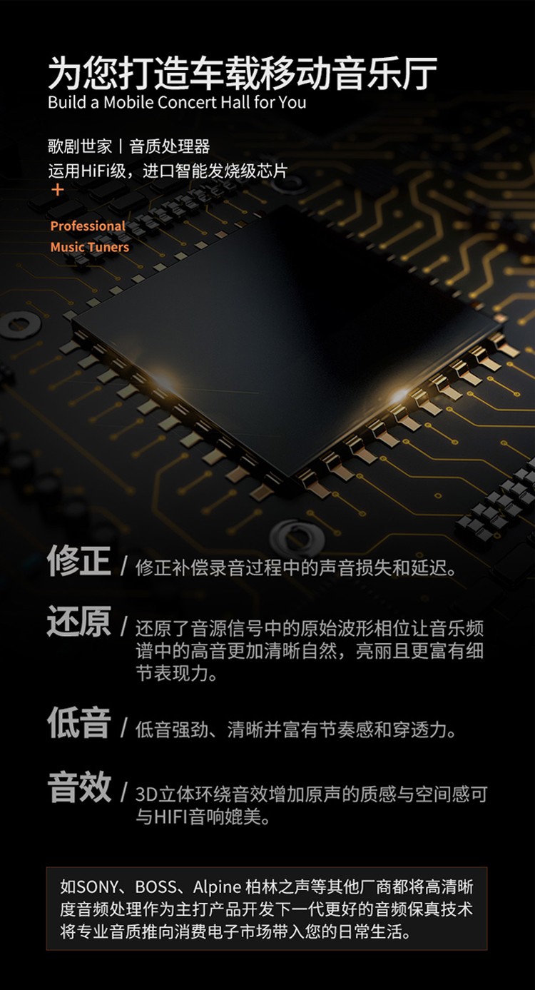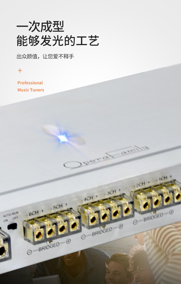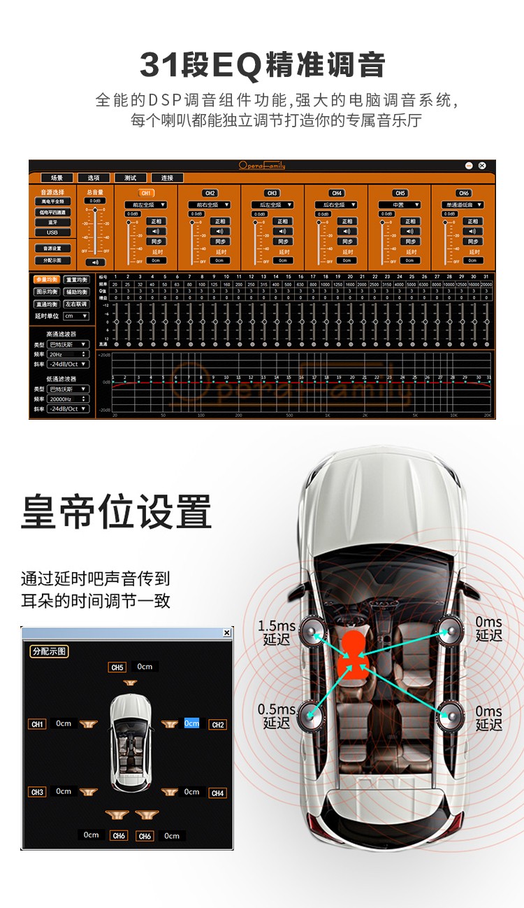 采用4組高電平喇叭線輸入,4組低電平RCA輸入和同軸數(shù)字音頻信號輸入,4X60W功率輸出,48位雙核CPU處理器。