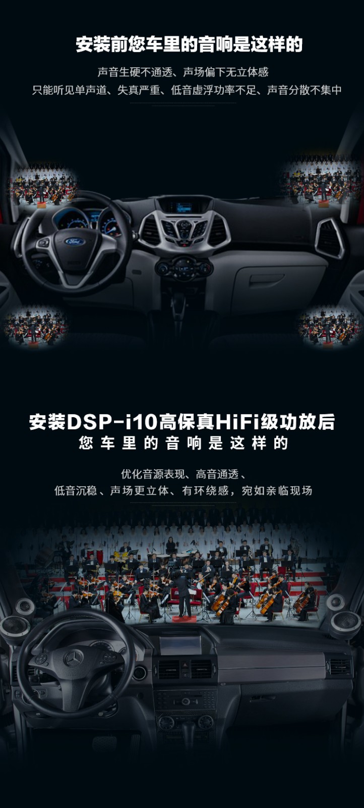 專車專用汽車音響功放DSP-i10采用專車專用線材,實(shí)現(xiàn)三百多種車型與原車對接而不破壞原車的線路,實(shí)現(xiàn)無損升級音響系統(tǒng)。擴(kuò)張用的8路RCA輸出,滿足音響愛好者大的可玩空間。