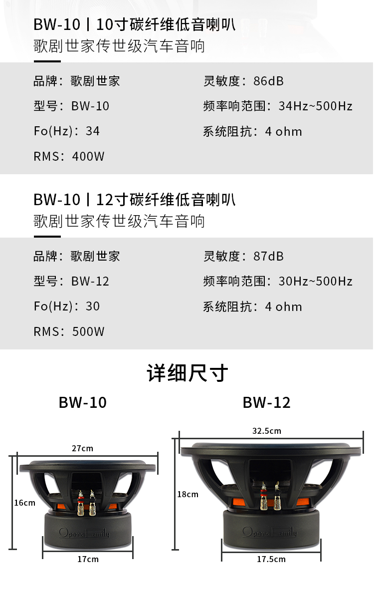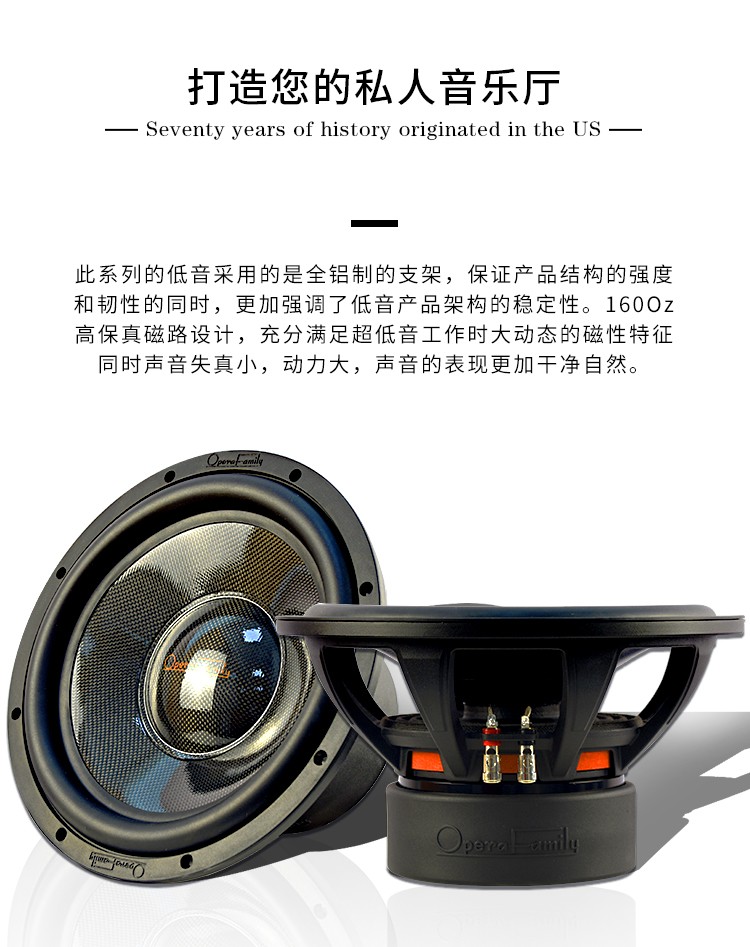 品牌: Opera family/歌劇世家巴羅克系列 型號: BW12寸 低音喇叭 顏色分類: 10寸 12寸 碳纖音盤,航空鋁盤架,額定500W
