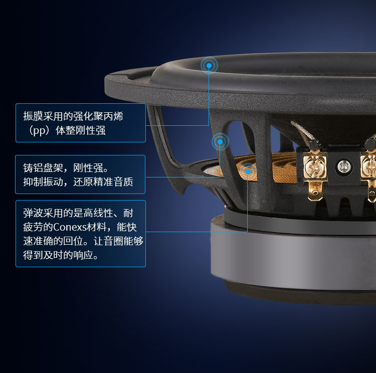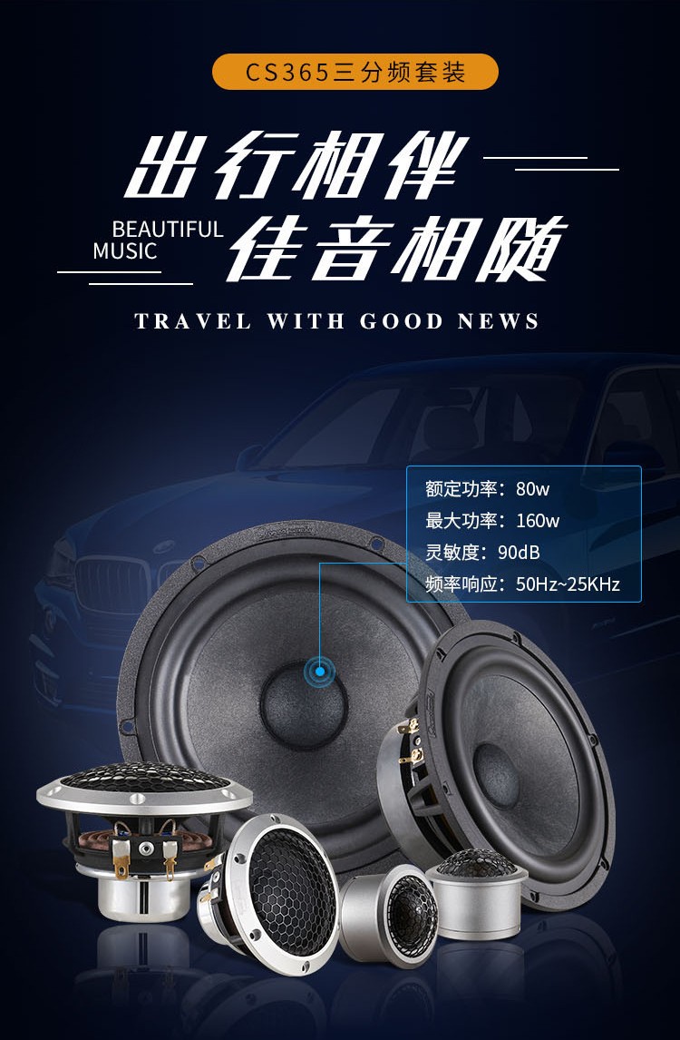 汽車音響喇叭CS365高效的磁路系統(tǒng)再加上精鑄鋁盆架,聲音通透自然,低頻厚實(shí)而強(qiáng)勁有力。高音單元CS52TW的球頂振膜采用德國(guó)進(jìn)口真絲制作,表面特殊涂層處理工藝,分頻器采用美國(guó)erse電容,高純度銅質(zhì)的空芯電感。