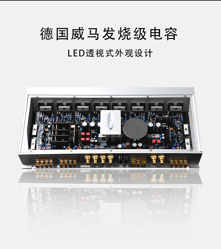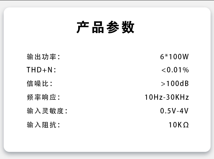 定制純銅鍍金、電源端子、喇叭端子; 德國威瑪發(fā)燒級電容; LED透視式外觀設(shè)計; 開關(guān)式輸入增益調(diào)節(jié); 輸入功率:6x100W THD+N:<0.01% 信噪比:>100dB 頻響范圍:10Hz-30kHz 輸入靈敏度:0.5V-4V 輸入阻抗:10kΩ