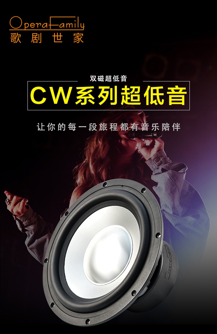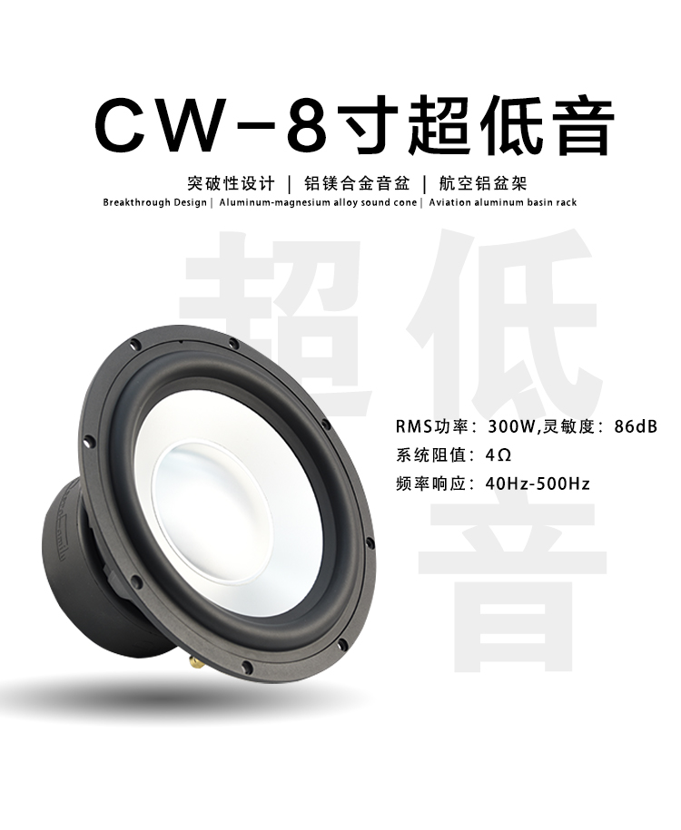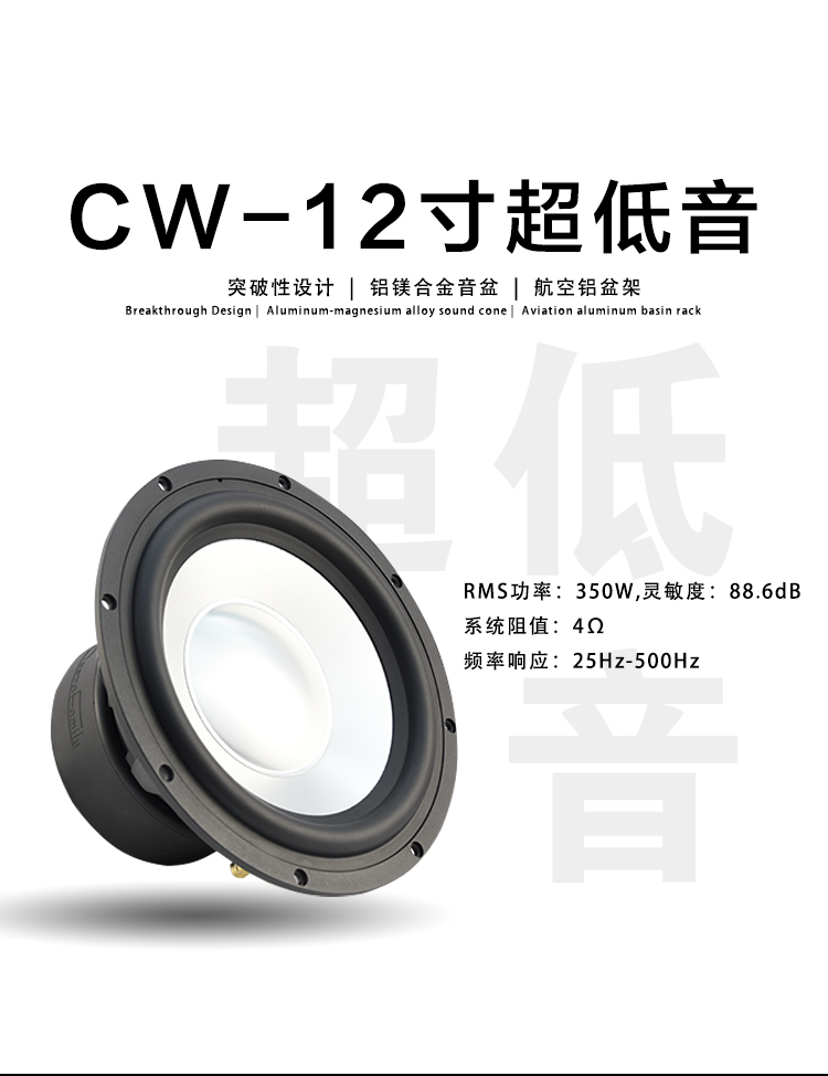 CW-8:Fo(Hz):48 / RMS功率:300W / 靈敏度:86dB / 系統(tǒng)阻抗:4Ω / 頻率響應(yīng):40Hz-500Hz CW-10:Fo(Hz):36 / RMS功率:300W / 靈敏度:86dB / 系統(tǒng)阻抗:4Ω / 頻率響應(yīng):36Hz-500Hz CW-12:Fo(Hz):25/ RMS功率:300W / 靈敏度:88.6dB / 系統(tǒng)阻抗:4Ω / 頻率響應(yīng):25Hz-500Hz 歌劇世家八寸、十寸、十二寸雙磁超低音,鋁鎂合金音盆,航空鋁盤架。